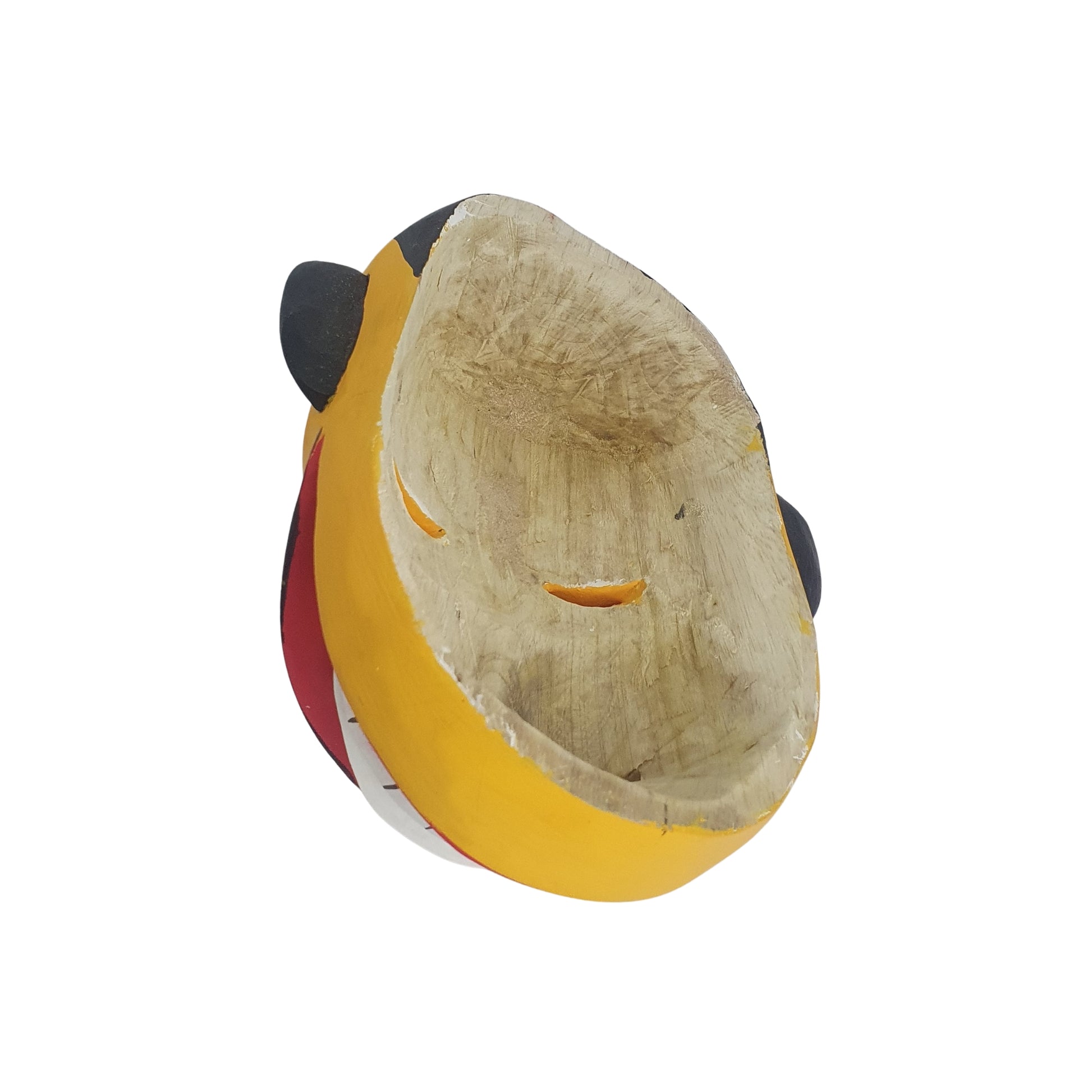 In colouring a dark brown paint has been used. Gunasinghe has stated that this face has a jovial appearance, with eyes protruding a little way forward, and tongue partly hanging out. In the Olaboduwa, Gonapola, Kolarn Kuttama (comic dance troupe) a well built sturdy figure has been created with moustaches turned upwards with a smiling mouth.