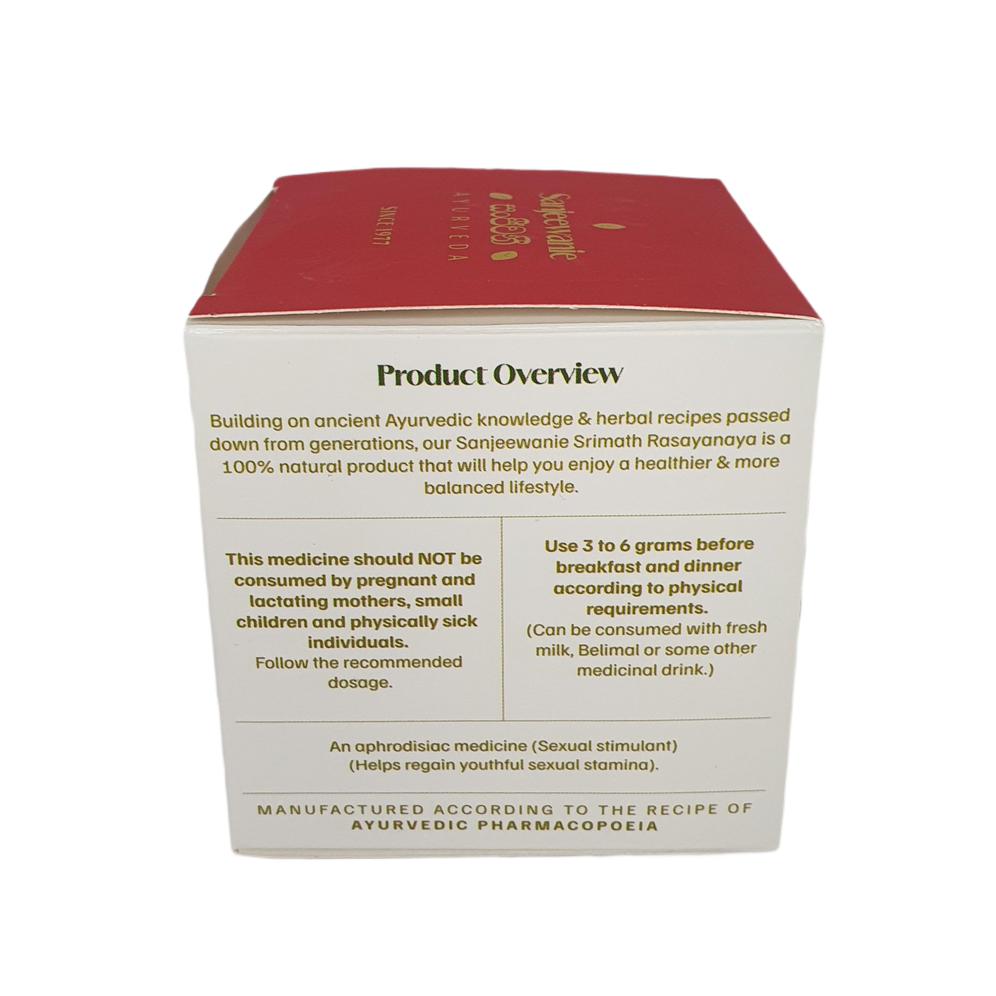 සංජීවානී ශ්රීමත් මදන මෝදකය (130g) යනු 100% ස්වාභාවික ඔෂධී පත්ර වලින් සාදන ලද බලවත් ආයුර්වේදික සංයෝජනයක් වන අතර යෞවන ප්රතිසාධනය, විවේකය සහ ශක්තිය වැඩි කිරීම සඳහා උපකාරී වේ. පුරාණ ආයුර්වේද ඥානය මත පදනම්ව, මෙය ශාරීරික සහනශීලතාව වැඩි කරයි, සෞඛ්ය සම්පන්න ජීර්ණය ප්රවර්ධනය කරයි, ප්රතිශක්ති පද්ධතිය ශක්තිමත් කරයි සහ ශරීරය හා මනස නැවත ජීවමාන කරයි. සම්ප්රදායිකව ස්වාභාවික කාමෝද්දීපකයක් ලෙස භාවිතා වන මෙය ශක්තිය, තැන්පතු සහ සමස්ත සෞඛ්යය වැඩි කිරීමට උපකාරී වේ.